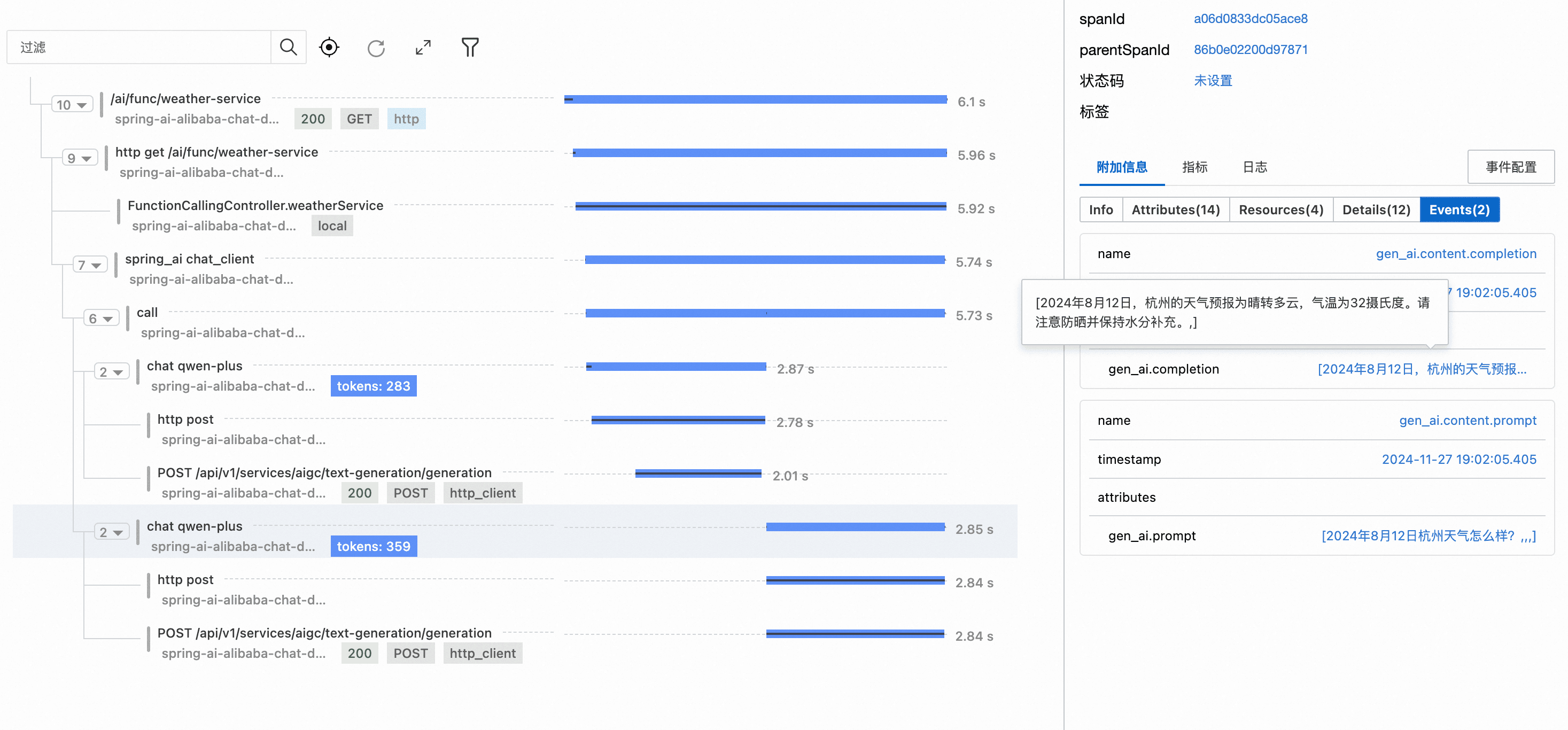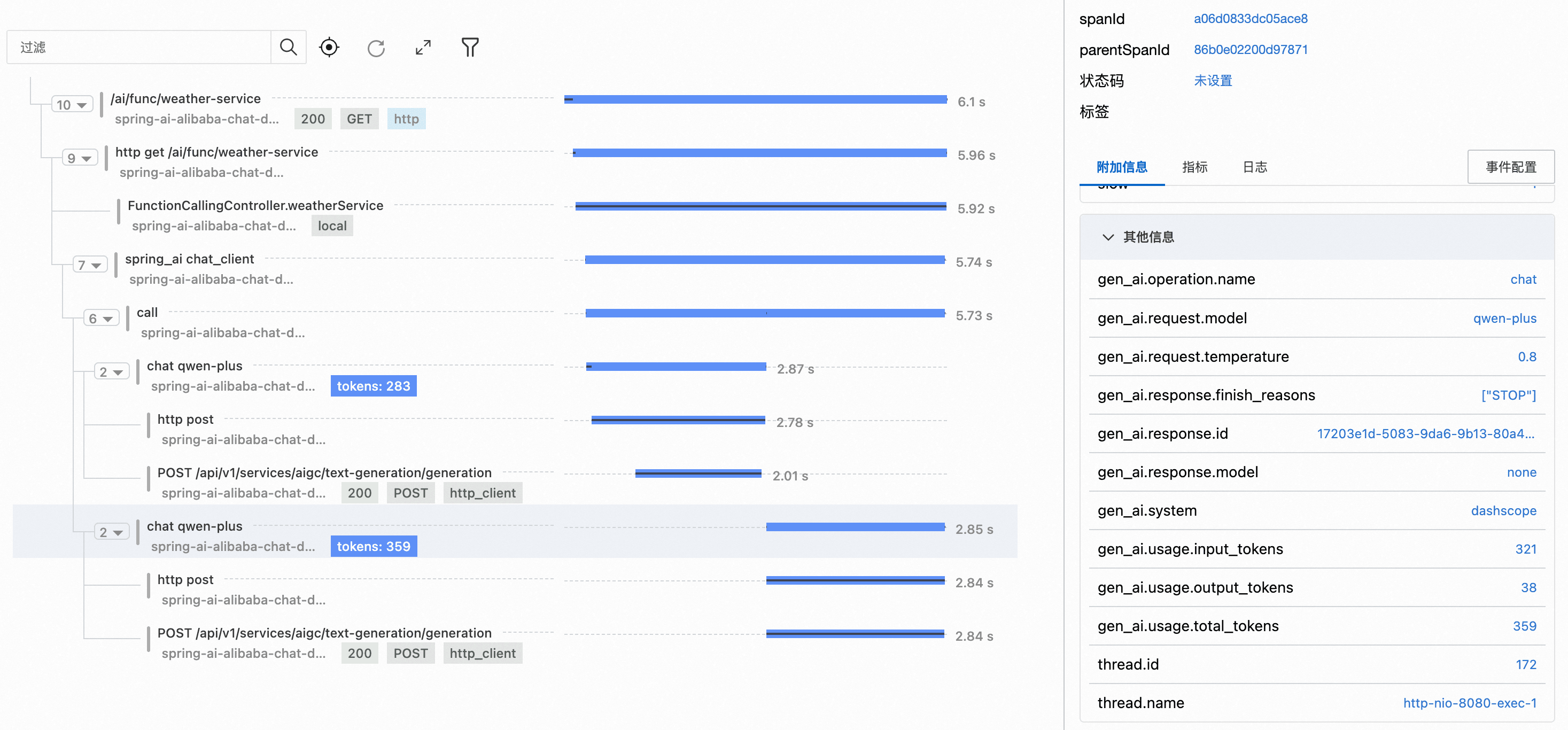 在生成式 AI 应用中,可观测性也是一个非常重要的能力,它不仅可以应对应用本身的性能调优、错误追踪等常规问题,还能成为解决 AI 应用中成本控制、模型偏见、模型幻觉等问题的利器。Spring AI Alibaba 在 Spring AI 可观测性基础上进行了扩展,对通义系列大模型及阿里云工具集的可观测性进一步扩展,提供了更加细节的可观测能力。此外,阿里云应用实时监控服务(ARMS)原生集成了对 Spring AI 可观测性数据的支持,使用者无需修改业务代码,只需适当调整启动配置,就能获得全套的企业级可观测服务。