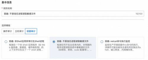 - **开启告警规则:**创建告警规则时选择内置的容器审计模板,开启『容器:不受信任进程读取敏感文件』,监控对非预期路径(如 /etc/passwd、/root/.ssh/、/etc/shadow等)写文件操作,确保此类事件能够被及时发现。