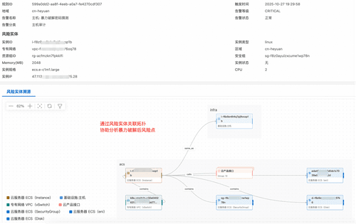 一旦检测到暴力破解告警,系统会自动构建从底层主机到云端 ECS 的关联视图,并展示 VPC、安全组等周边资产。这种“由点及面”的视角,协助运维人员在发现攻击的同时,迅速判断内网横向移动的风险边界,制定更精准的封堵策略。