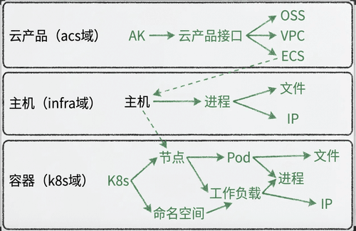 - 云产品域(ACS):基于操作审计日志,还原资源操作链路。从 AK(身份凭证) 发起,追踪 云产品接口 调用,最终落地到 OSS、VPC、ECS 等具体云资源,审计“谁在何时动了什么资源”。