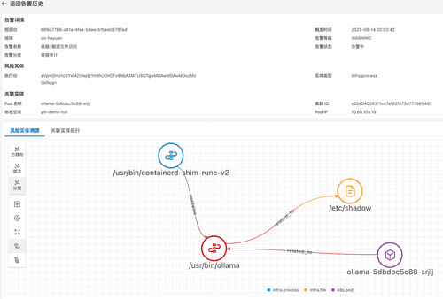 - **告警调查,风险溯源,一键直达:**告警通过调查按钮直达风险拓扑,快速锁定风险实体,并提供告警事件的完整调用链和实体关联图,将复杂的风险关系以拓扑图的方式直观呈现,降低理解门槛。