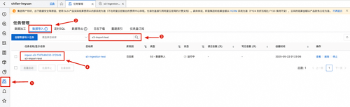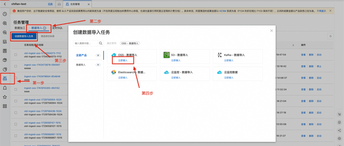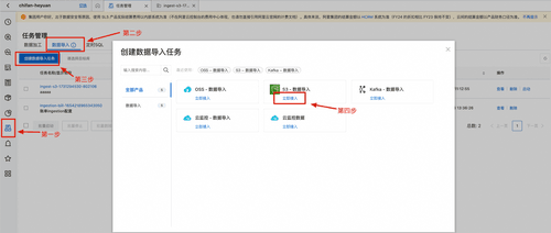 之后进入要导入数据的project中,通过任务管理开始创建OSS数据导入任务,按照下面提示依次点击: