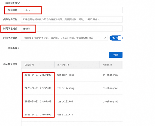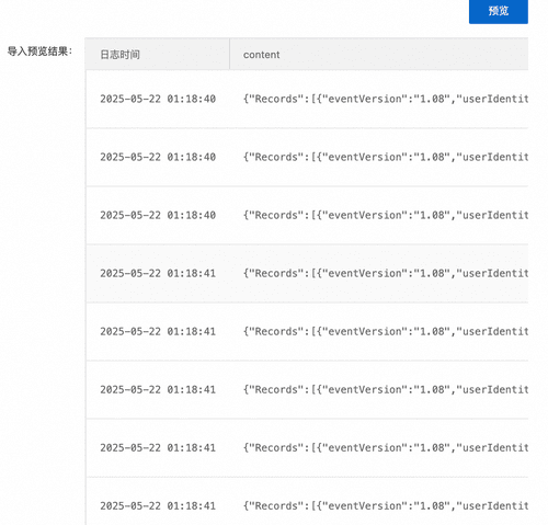在上述场景下,当日志导入到sls时,日志的时间戳会记录为数据进入sls的时间点,有时这是不符合用户预期的,这就需要针对日志时间进行一些配置。如下图所示,我们数据中会有一个名为__time__的字段记录时间戳,样例为:1743604620,然后将时间字段格式设置为epoch,如果不知道应该怎么设置,可以参考时间格式。之后点击预览查看数据导入样例,如下图所示。最后点击下一步即可创建出OSS数据导入任务。