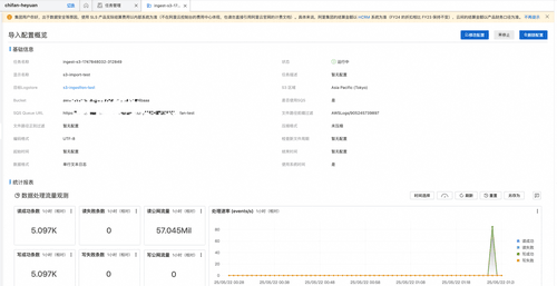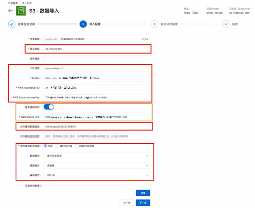 接下来进行具体的设置,按照下图中提示依次进行填写或选择。这里我们设置显示名称为:s3-import-test,该名称将显示在任务概览界面上。然后选择源数据bucket所在区域,这里我们选择ap-northeast-1。之后键入源bucket。之后需要依次渐入具有权限的AWS AccessKey ID以及AWS Secret AccessKey,用于拉文件数据使用。接下来,可以选择启用SQS或者不启用SQS,区别是使用sqs时,会从sqs中获取新增文件元信息,否则遍历s3 bucket来获取新增文件元信息,一般当bucket中文件数量超过100w,建议启用SQS,否则数据延迟将逐渐增加。在示例中,我们使用了SQS。接下来同样可以指定想要获取数据的文件路径前缀,以及设置文件路径正则来进行文件过滤。然后也可以通过设置文件修改时间过滤来指定要导入的文件时间范围。通过设置数据格式/压缩格式/编码格式来指导如何解析数据。