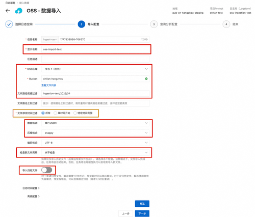 接下来进行具体的设置,按照下图中提示依次进行填写或选择。这里我们设置显示名称为:oss-import-test,该名称将显示在任务概览界面上。然后选择源数据bucket所在区域,这里我们选择杭州。之后下拉选择源bucket。由于我们只需要导入2025年4月的数据,所以我们可以给文件路径前缀写入具体的文件路径--ingestion-test/2025/04。这里就不需要额外地设置文件修改时间范围,直接导入所有就行。数据格式的设置需要根据具体文件数据来进行,如我们的数据是单行json,使用了snappy压缩。因为只需要一次性导入历史文件,这里检查周期选择永不检查即可,由于不涉及归档文件,这里没有打开该按钮。到这一步,我们就设置好了一个OSS数据导入任务,点击预览,即可看见该设置下数据导入的结果样例,如果符合需求,点击下一步即可创建任务,否则应该进行微调。
