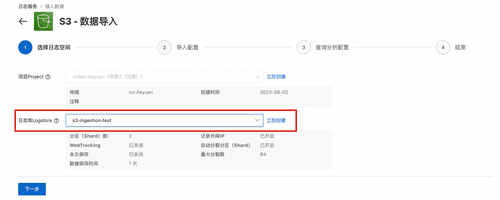 在任务创建界面选择目标logstore,这里选择s3-ingestion-test,之后点击下一步