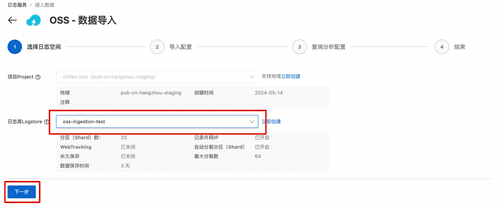在任务创建界面选择目标logstore,这里选择oss-ingestion-test,之后点击下一步