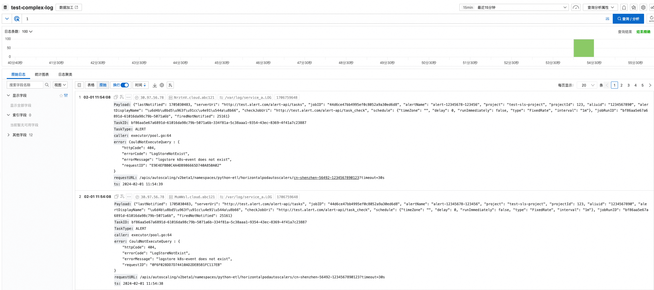 - 当前Logstore数据使用SLS SDK写入模拟数据,格式使用上述日志片段,其中包含JSON、复杂字符串等弱结构化字段。