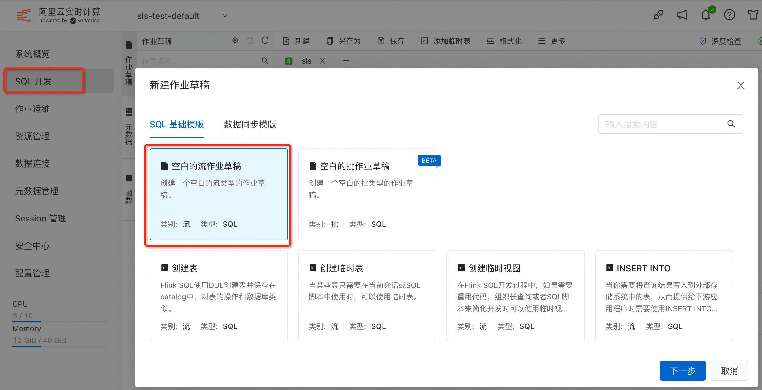 在阿里云Flink控制台创建一个空白的SQL的流作业草稿,点击下一步,进入作业编写