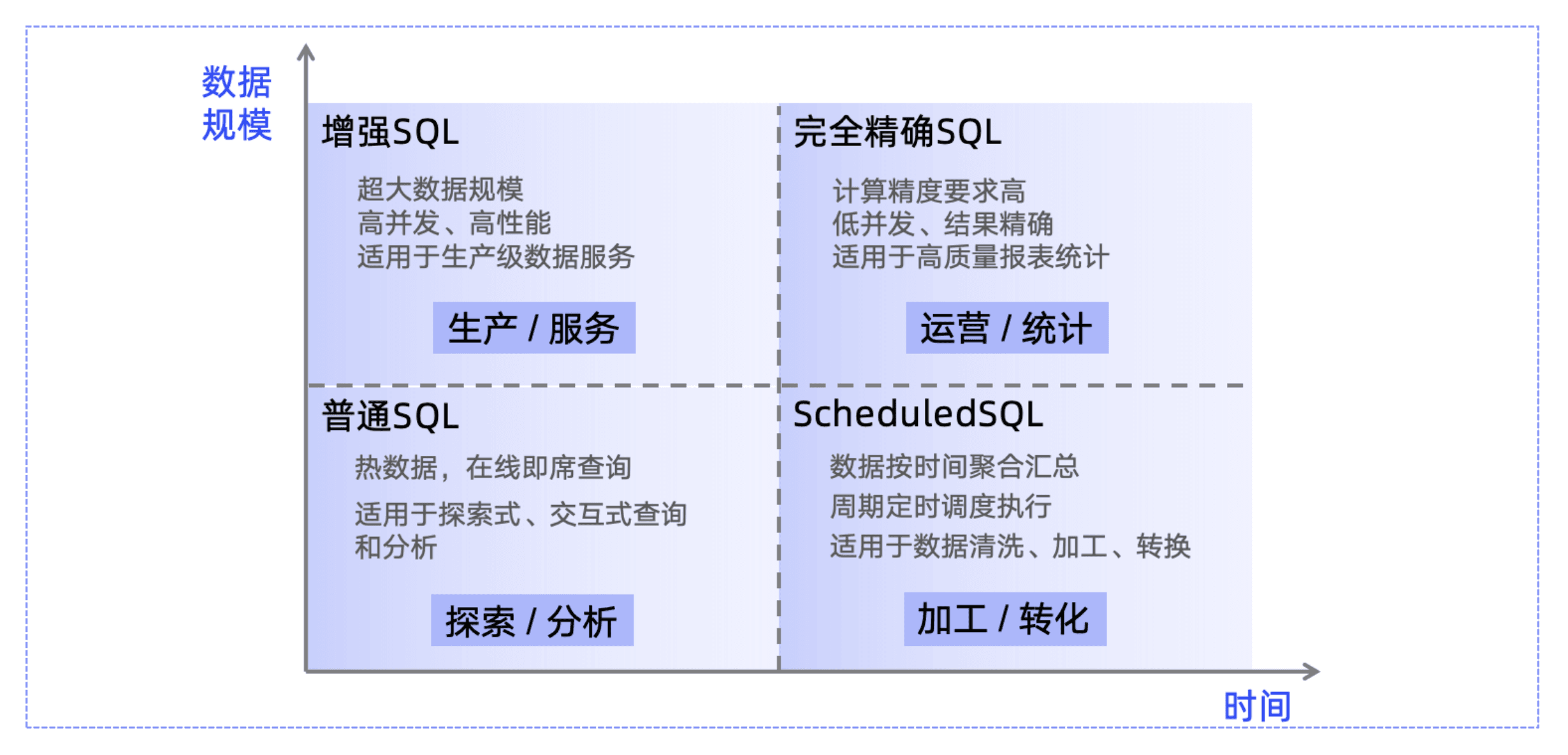 下图展示了一个能力象限模型,描绘了在不同的业务阶段和规模下,如何通过选择适当的SQL模式来最大化业务的数据分析效能。