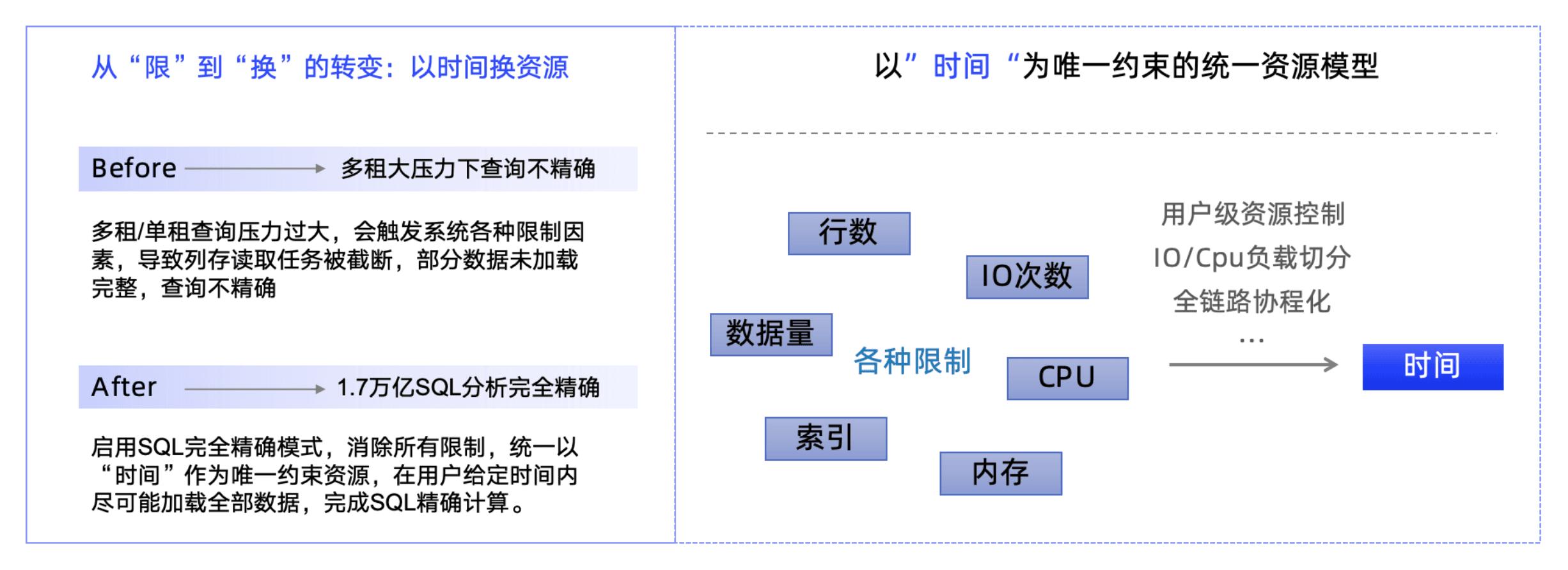 - 时间换资源:在用户指定时间内,Query稳定运行直至完成精确计算或超时。