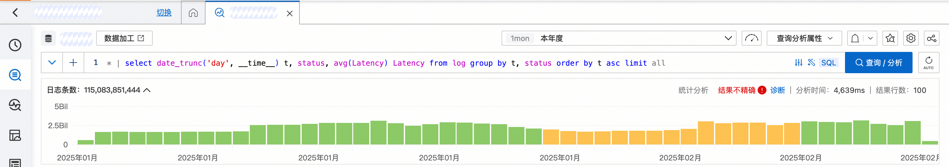 对于需要跨越较长时间周期(如季度或年度)的日志数据分析任务(例如年度运营报表),数据完整性至关重要。结果不精确将导致趋势分析结果失真,影响对业务变化的洞察。 - 复杂多列聚合