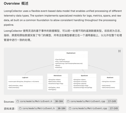 掌握核心数据架构是学习开源软件源码的关键,但是初学者往往抓不住重点,无从下手。通过 DeepWiki 开发者可以轻松获取 LoongCollector 核心数据模型的类型与关系,有了基础数据模型的理解,学习更高层次的源码将事倍功半。