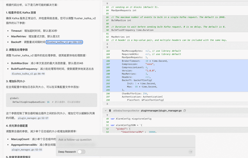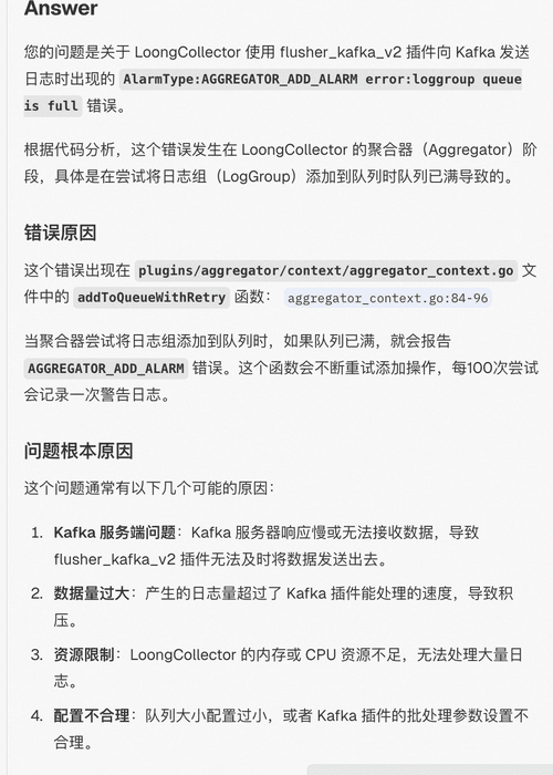 我们以 flusher_kafka_v2 插件为例,当开发者将日志采集至 Kafka 时,若遇到“AlarmType:AGGREGATOR_ADD_ALARMerror:loggroup queue is full” 报错,常引发性能瓶颈与数据丢失风险。针对此类场景,DeepWiki 通过多维度分析,从 队列配置、网络传输、资源竞争等角度系统性揭示反压成因,并提供可操作的解决方案。