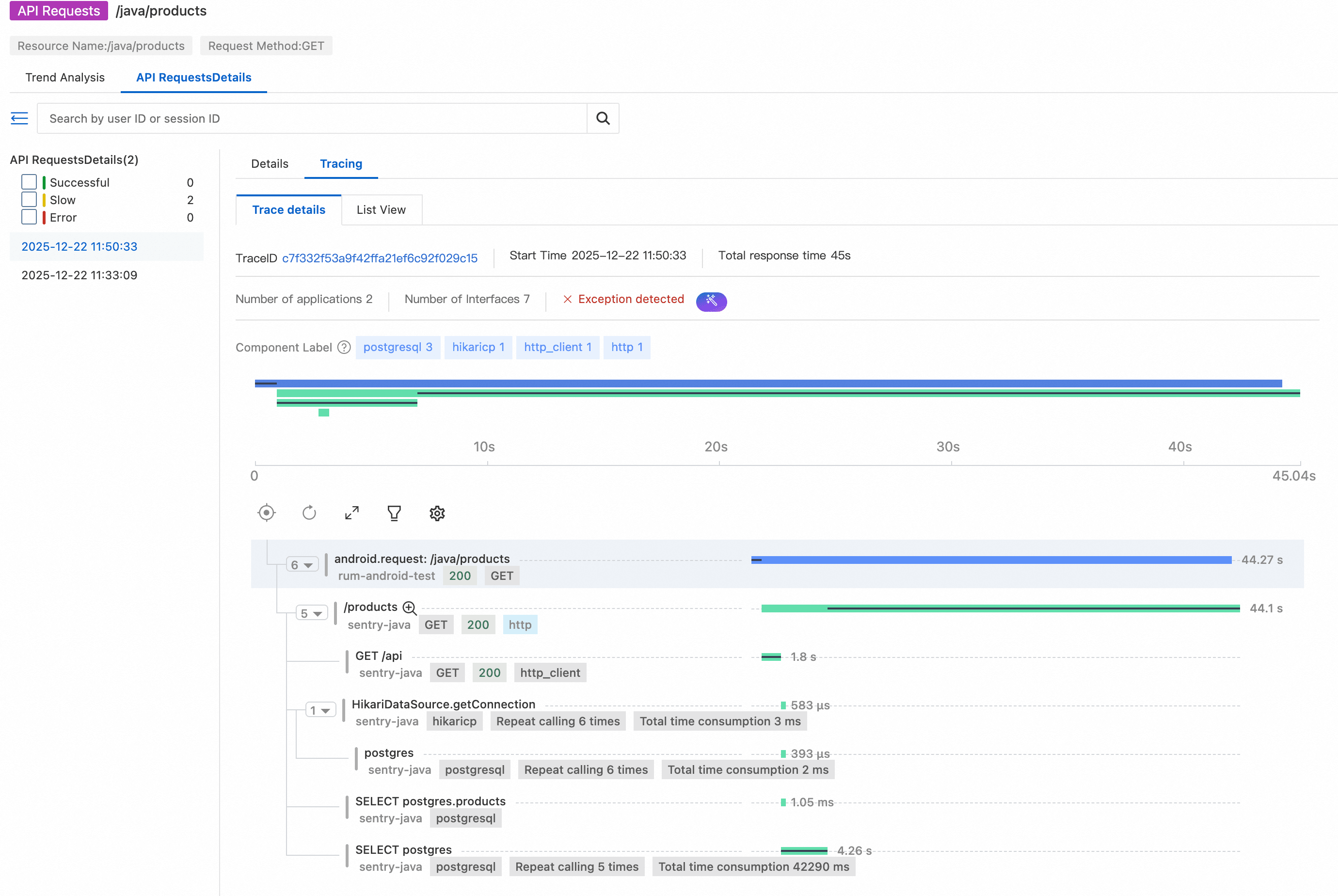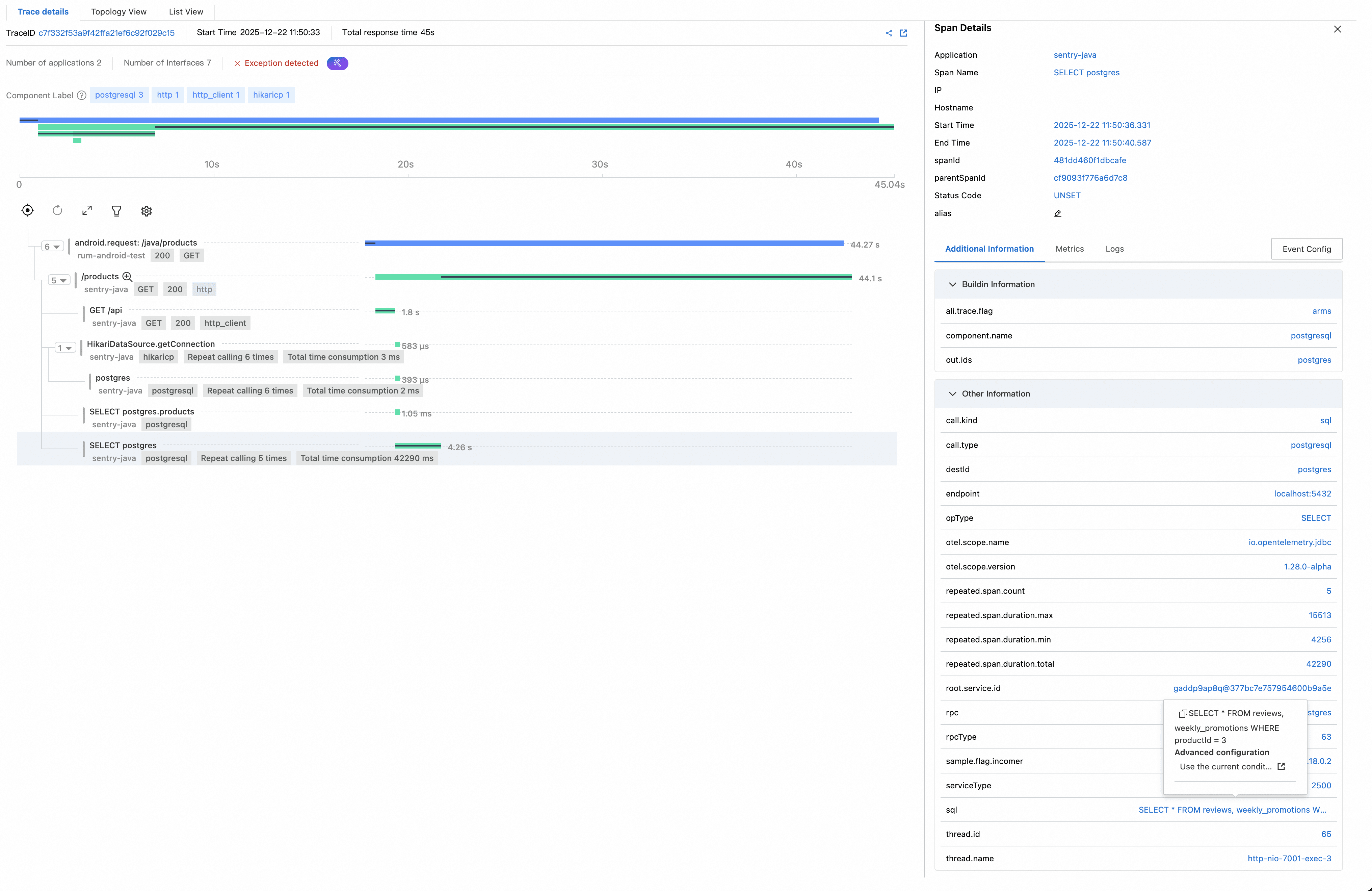 这里就是端到端链路打通的核心价值所在——我们可以直接看到从移动端到后端的完整调用链路,无需在多个系统之间来回切换。
