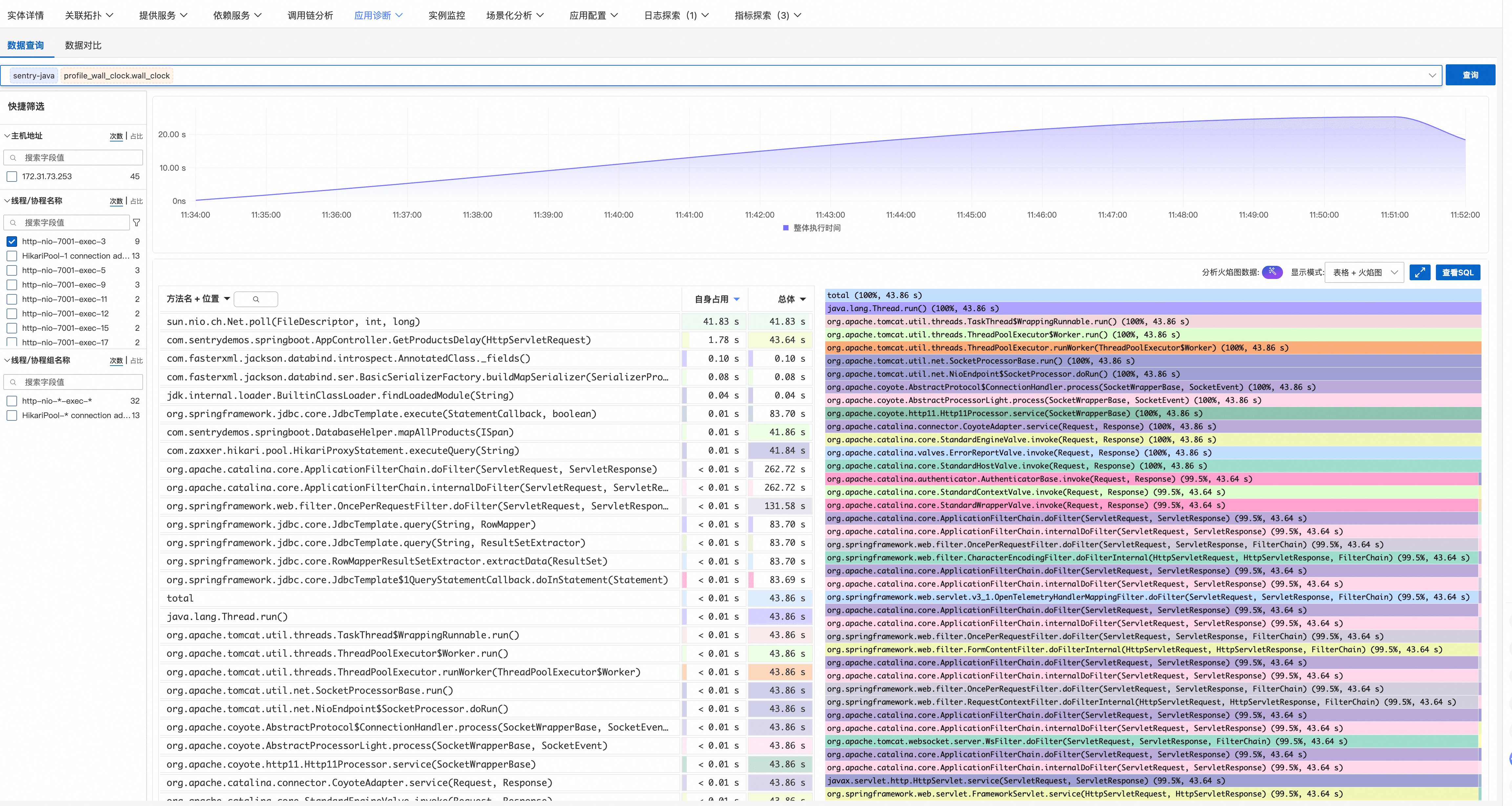 为了进一步确认我们的分析结论,我们进入 应用诊断 → 持续性能剖析,查看后端服务的 Profile 数据。