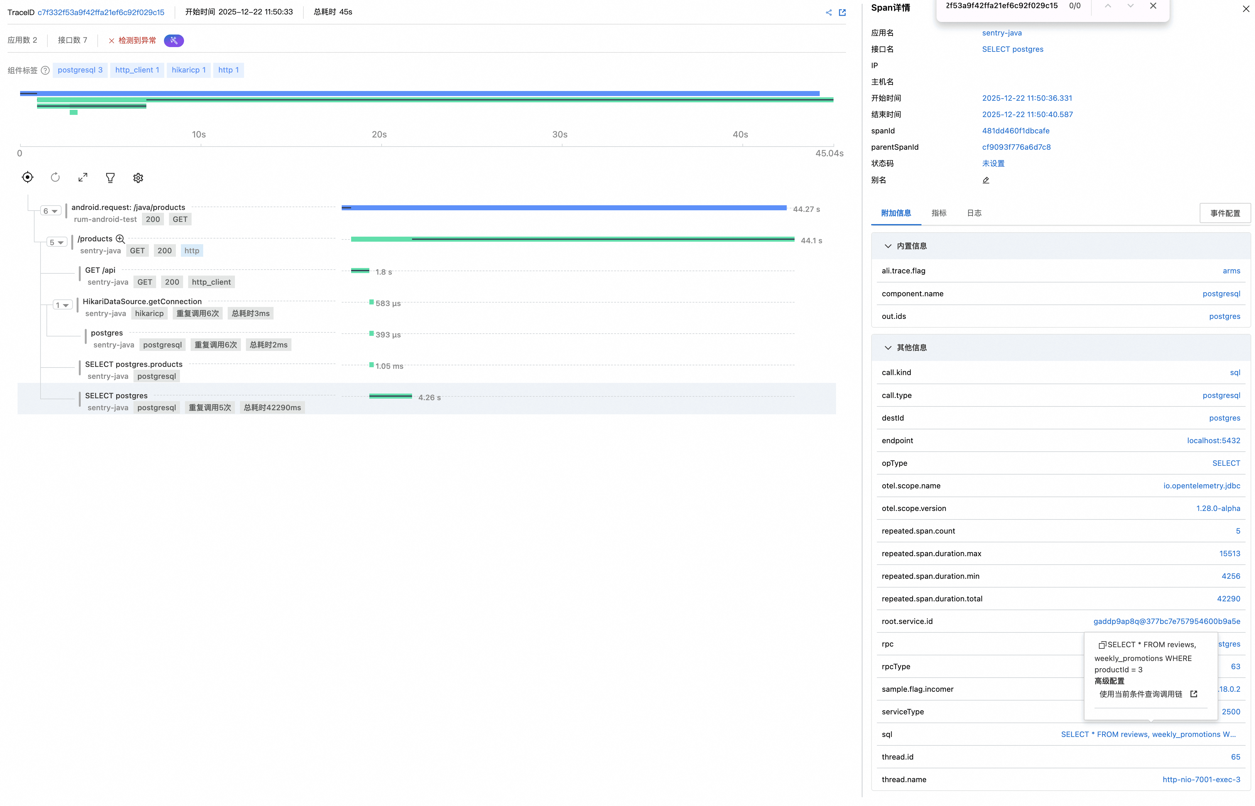 点击链路中的最后一个 Span,我们可以在右侧详情面板中看到具体执行的 SQL 语句: