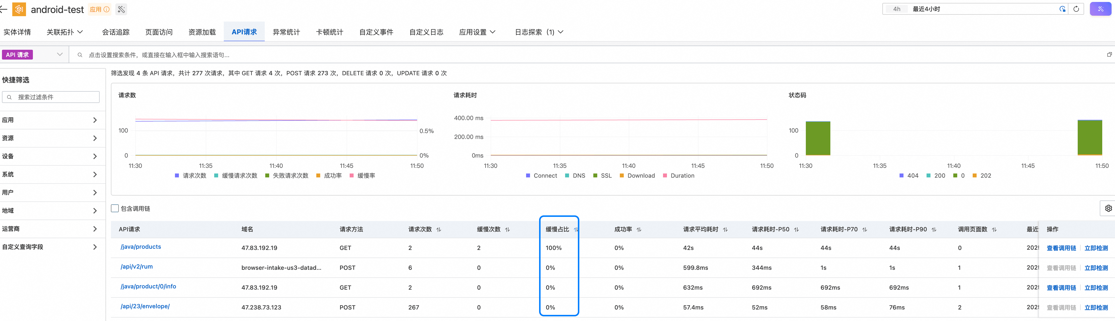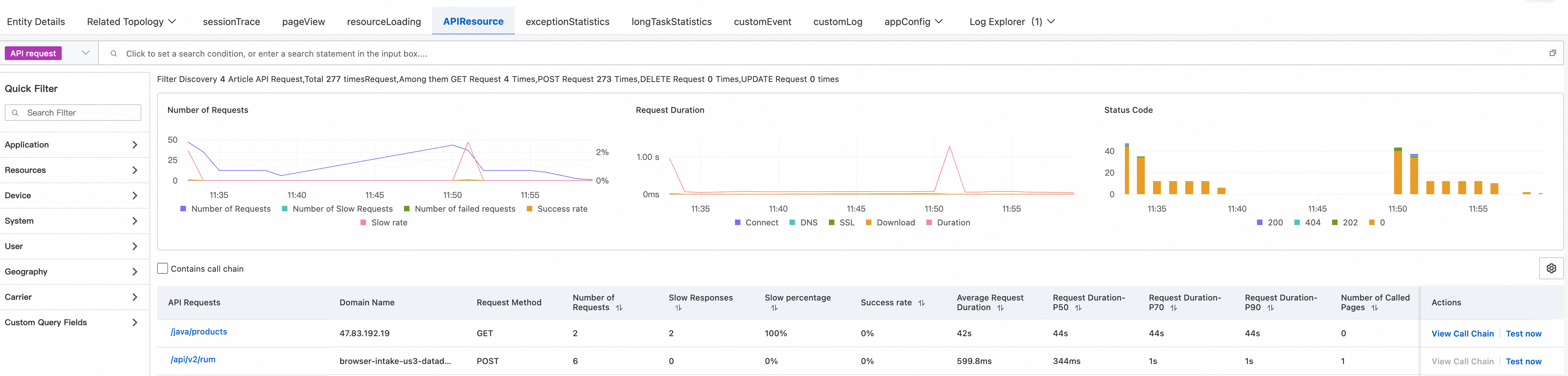 首先,我们登录阿里云控制台,进入云监控2.0控制台 → 用户体验监控 →您的应用 → API请求模块。在这里,我们可以看到所有 API 请求的性能统计数据。
