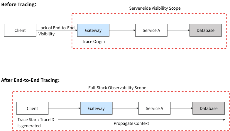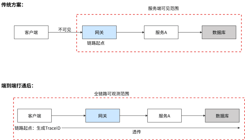 端到端链路打通的本质是:让客户端成为分布式追踪链路的第一跳,使其与服务端链路共享同一个 Trace ID。