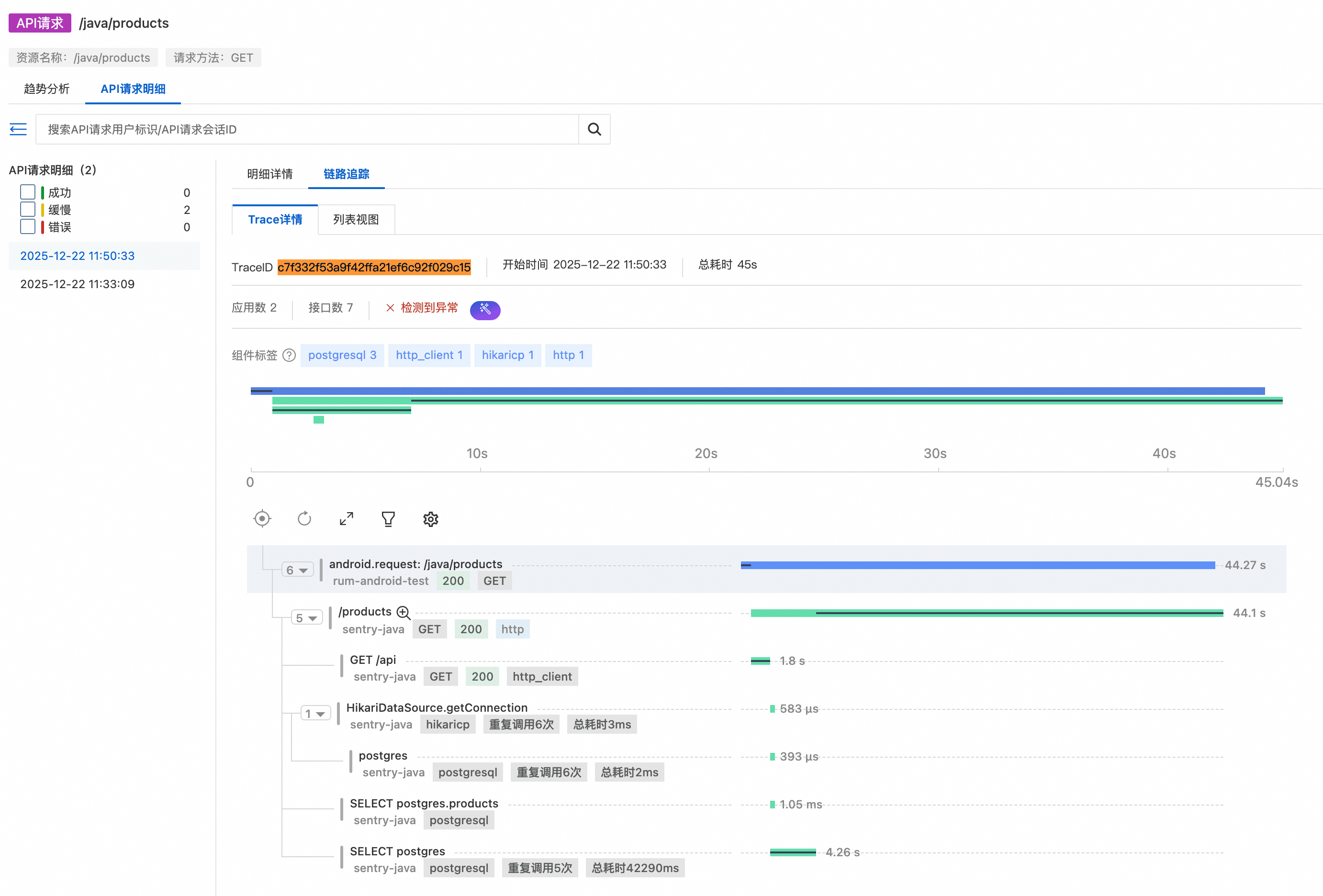 从监控数据可以清晰地看到,API /java/products 的响应时间异常——平均耗时高达 40 多秒!这个耗时远远超出了正常范围,难怪用户会感觉页面打开缓慢。