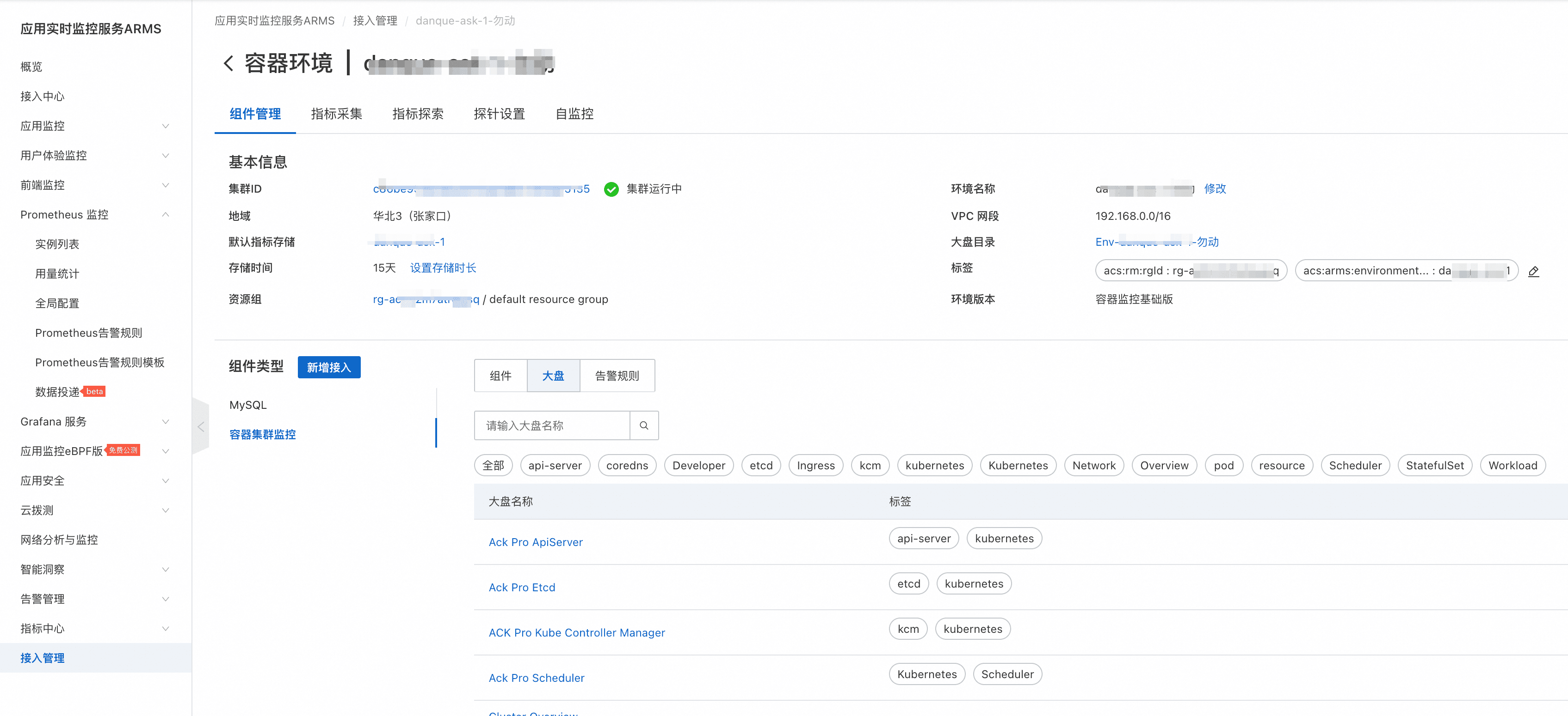 - 在阿里云Prometheus控制台的“接入管理”,配置VPC内各个要监控组件的接入,以便阿里云Prometheus生成采集Job、抓取监控数据、生成默认大盘和默认告警规则。