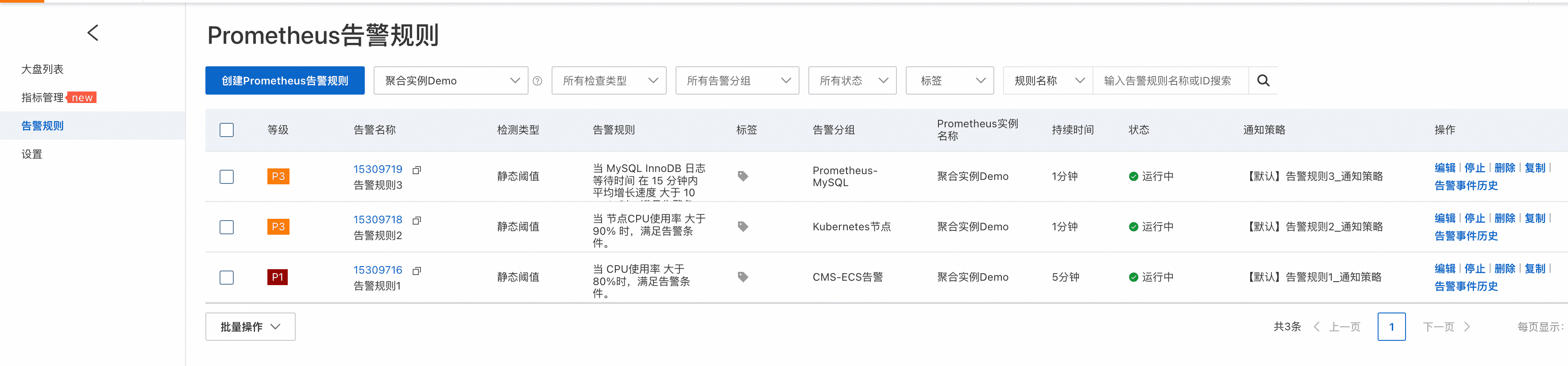 - 对于用户自定义告警规则,可在阿里云Prometheus控制台的“Prometheus监控”的“Prometheus告警规则”菜单创建和管理,或通过“Prometheus告警规则模板”导入已有的Prometheus告警规则。