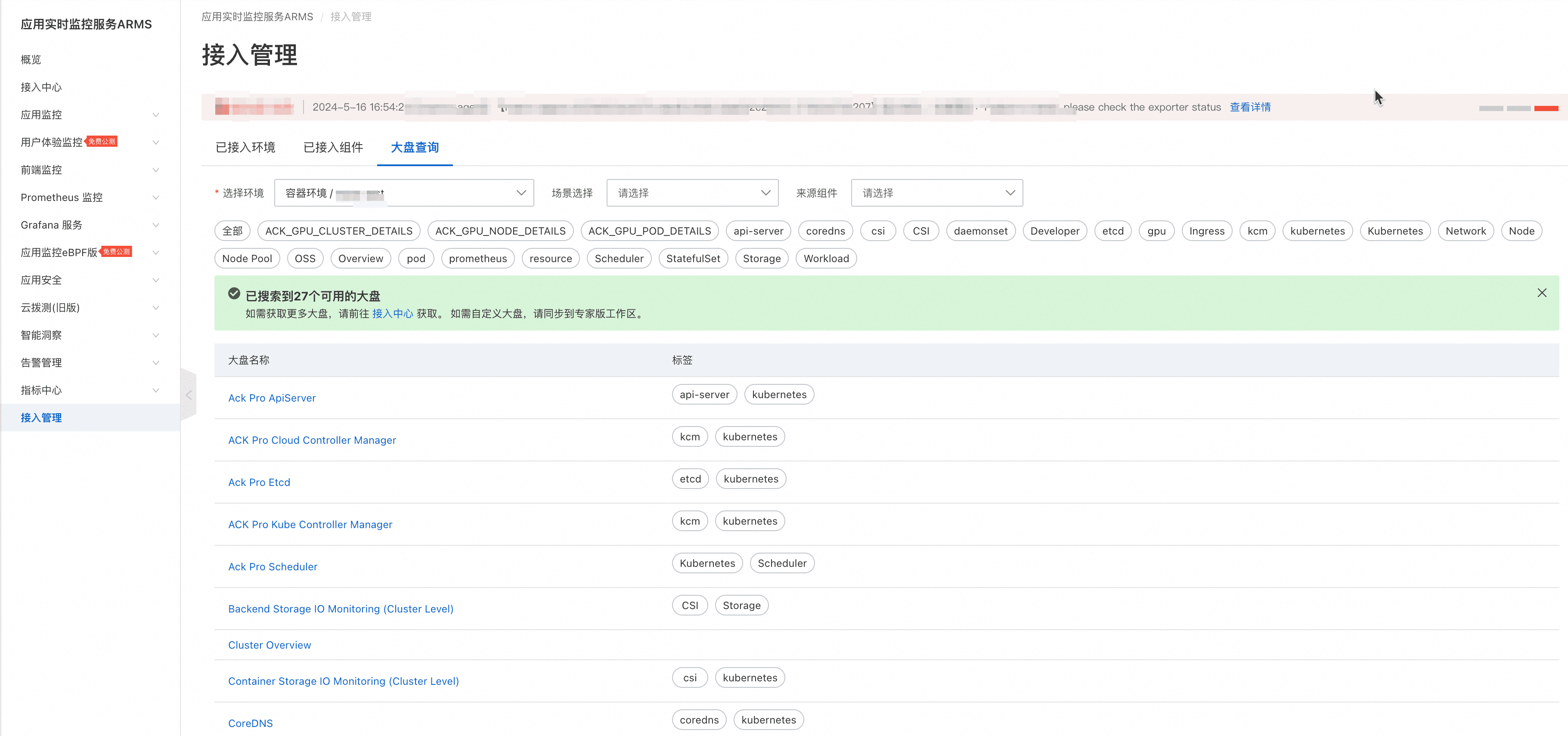 - 在阿里云Prometheus控制台的“接入管理”的“大盘查询”界面,即可查看各组件的默认大盘。