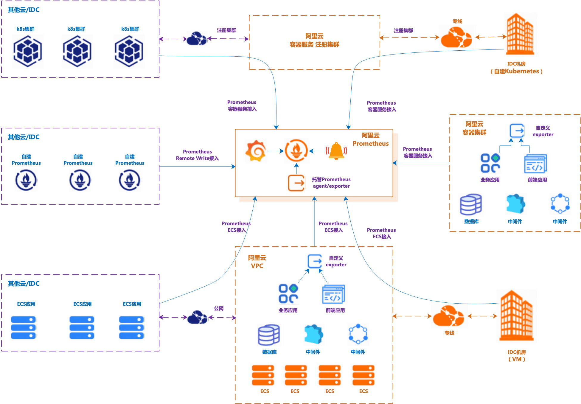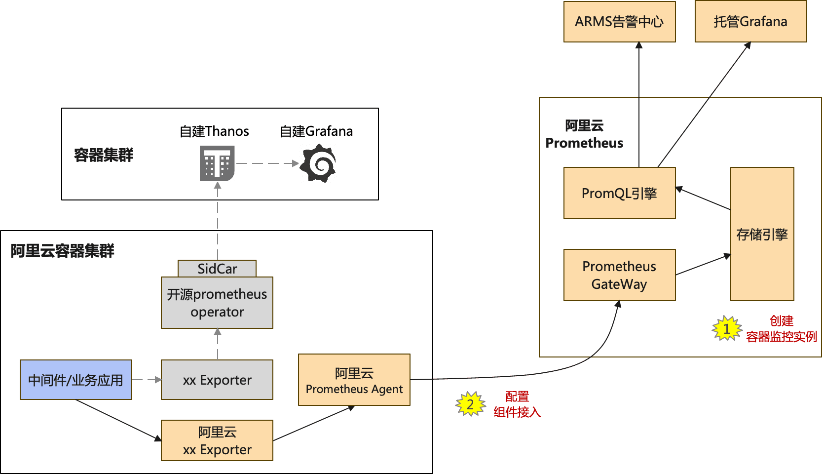 从自建开源Prometheus迁移到阿里云可观测监控Prometheus版包含指标采集、可视化分析、告警配置等三个阶段步骤,下面分别对这三个阶段在不同自建Prometheus部署场景下的方案进行讨论。