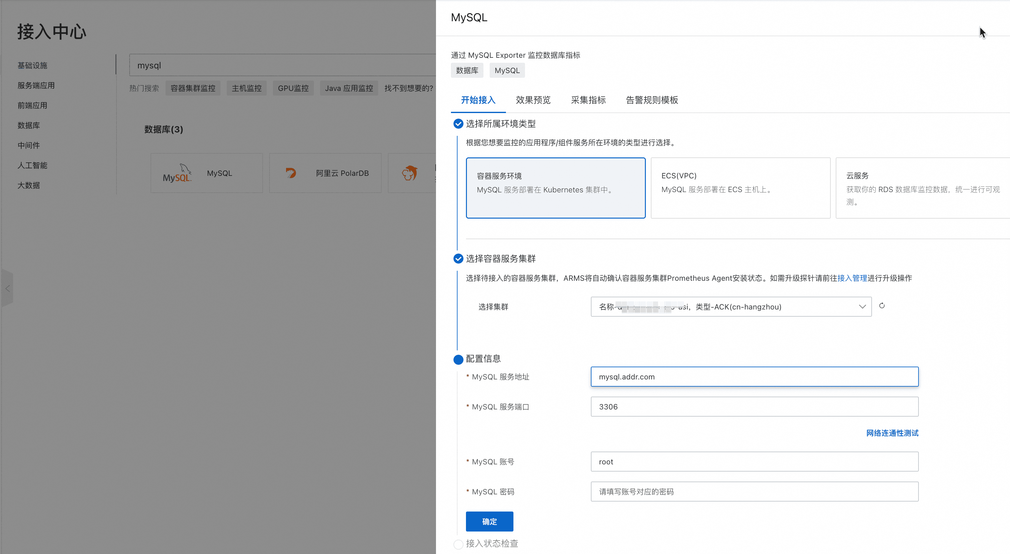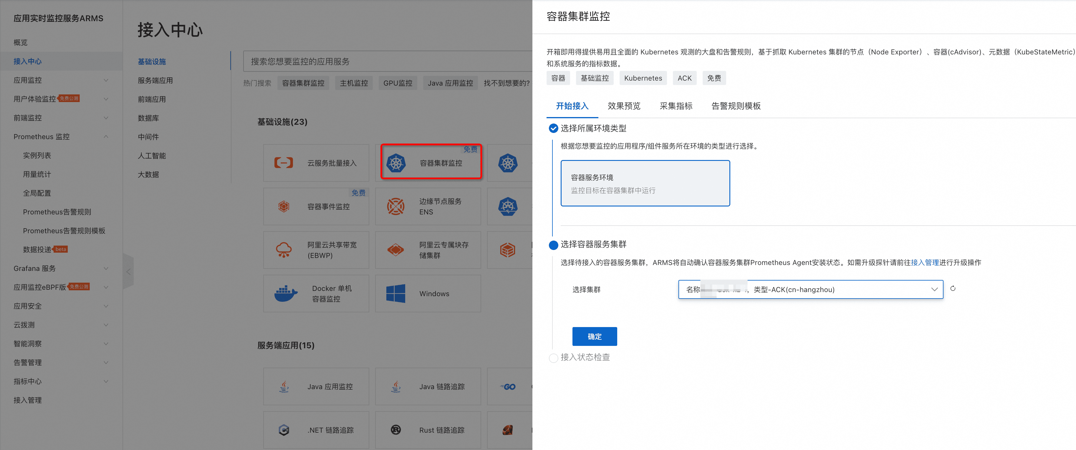 - 在阿里云Prometheus控制台的“接入中心”,选择“容器集群监控”接入,完成“容器环境”实例创建。