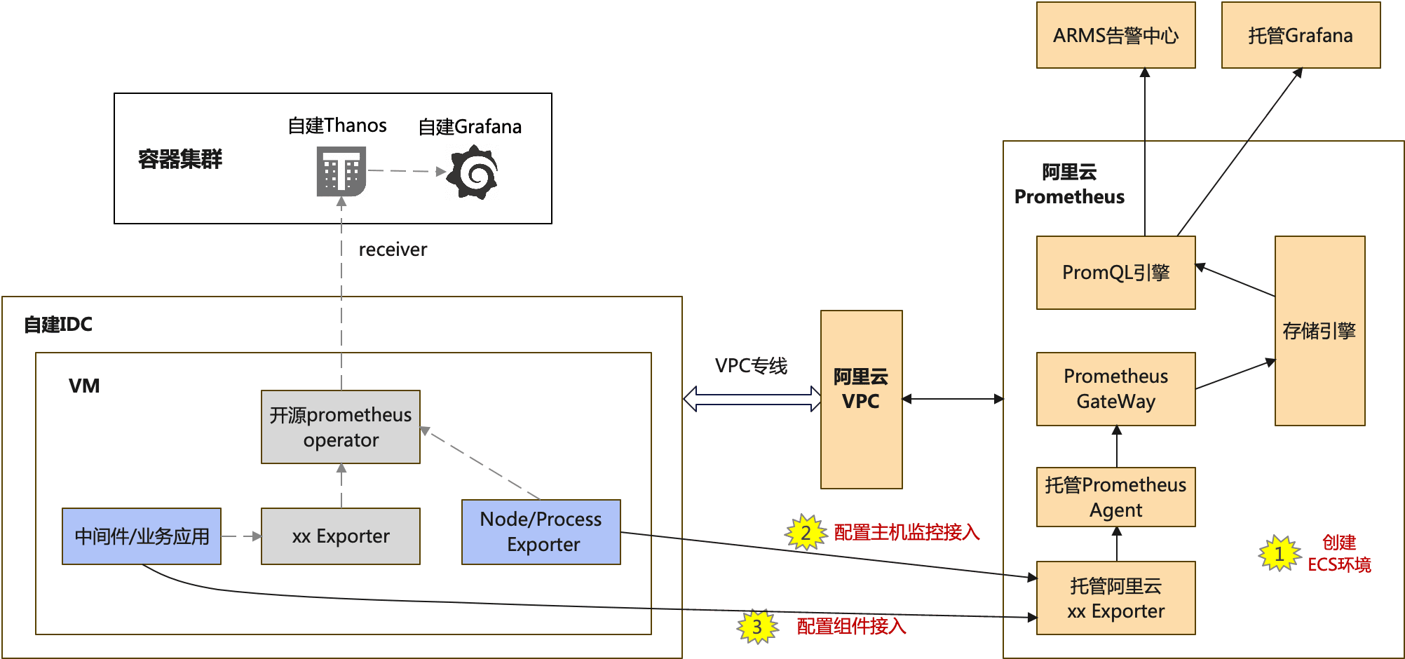 - 需要用户自行在自建IDC的各个VM上安装Node/Process Exporter。