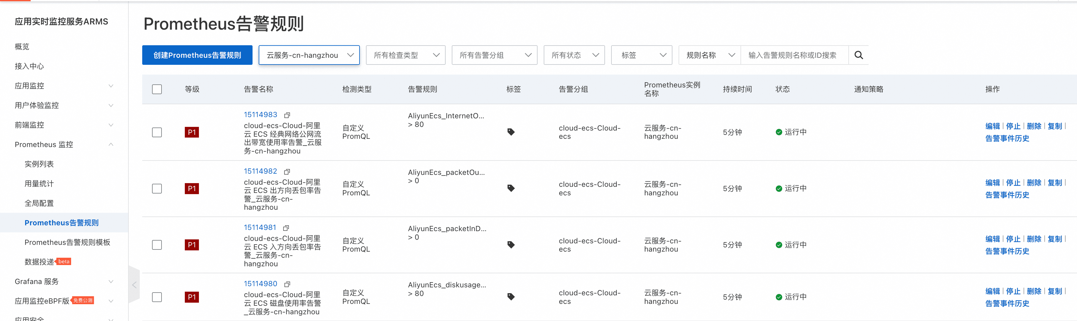 - 对于容器/Kubernetes和ECS接入场景,在阿里云Prometheus控制台的“接入管理”的“已接入组件”界面,点击对应组件的“告警列表”即可查看该组件默认生成的告警规则。
