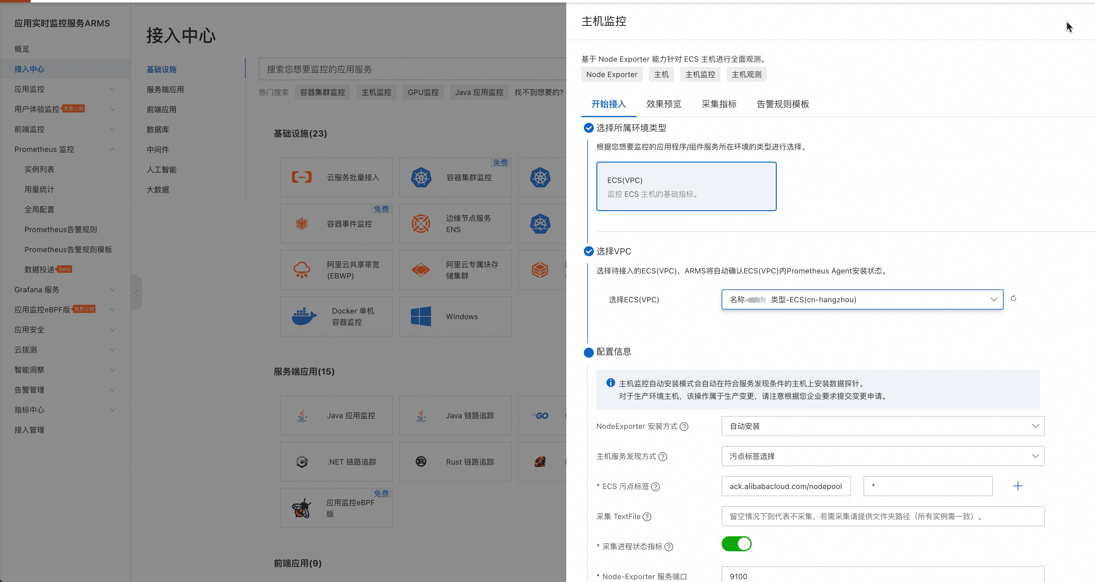 - 在阿里云Prometheus控制台的“接入中心”,选择“主机监控”,并按界面向导接入后,创建出“ECS环境”实例,同时部署ECS主机监控的Exporter和采集配置。