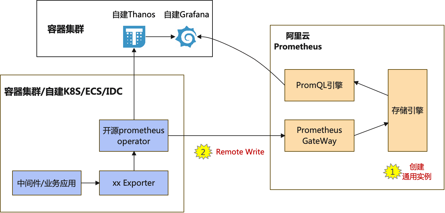 为了满足长期监控需求,通常用户在自建开源Prometheus的基础上,都会再部署一套或多套自建Thanos,将多个自建开源Prometheus数据集中、长期存储。
