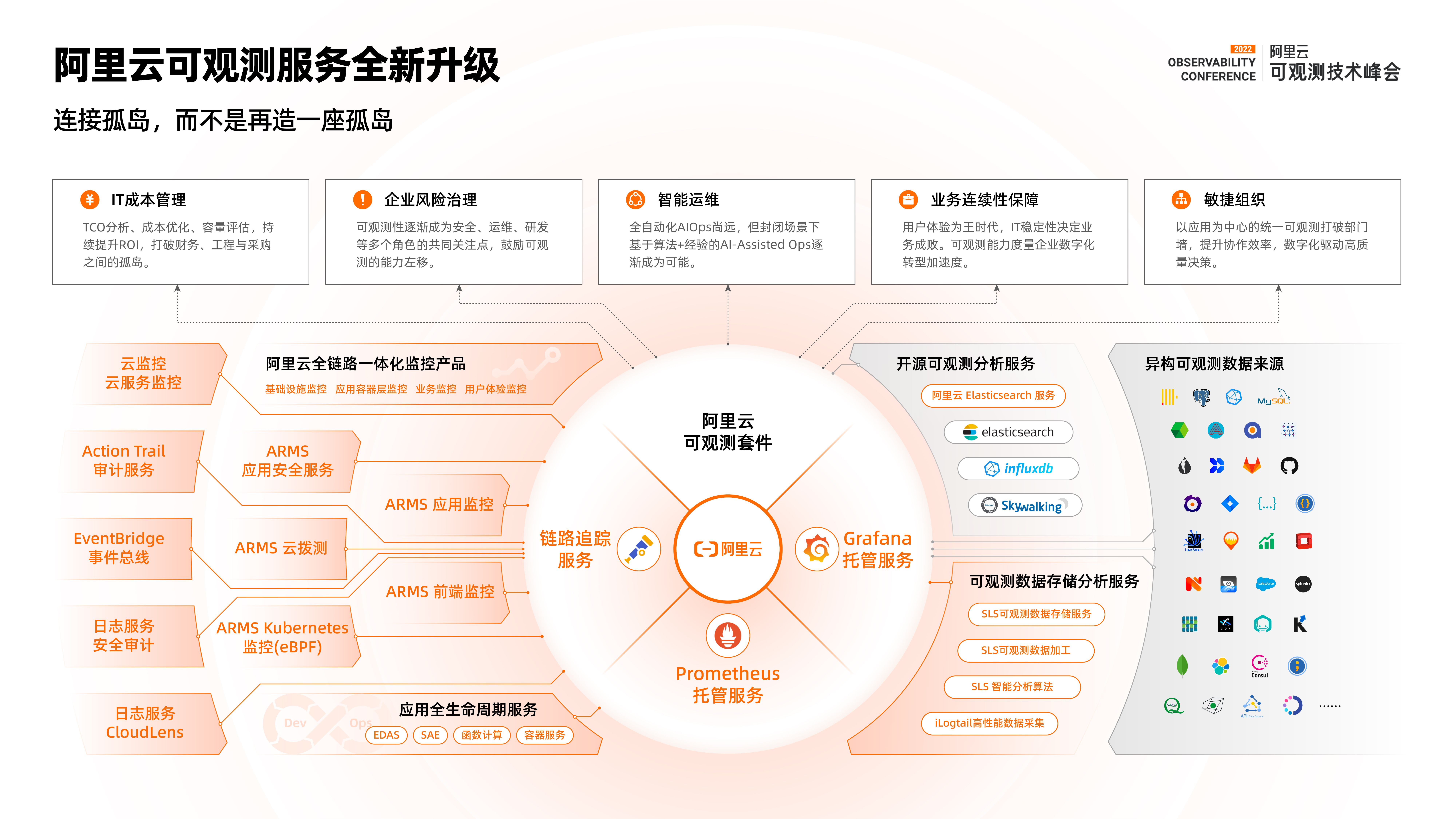 与此同时,阿里云可观测监控Prometheus作为阿里云可观测套件的重要组成部分,与Grafana服务、链路追踪服务,形成指标存储分析、链路存储分析、异构构数据源集成的可观测数据层,同时通过标准的PromQL和SQL,提供数据大盘展示,告警和数据探索能力。为IT成本管理、企业风险治理、智能运维、业务连续性保障等不同场景赋予数据价值,让可观测数据真正做到不止于观测。