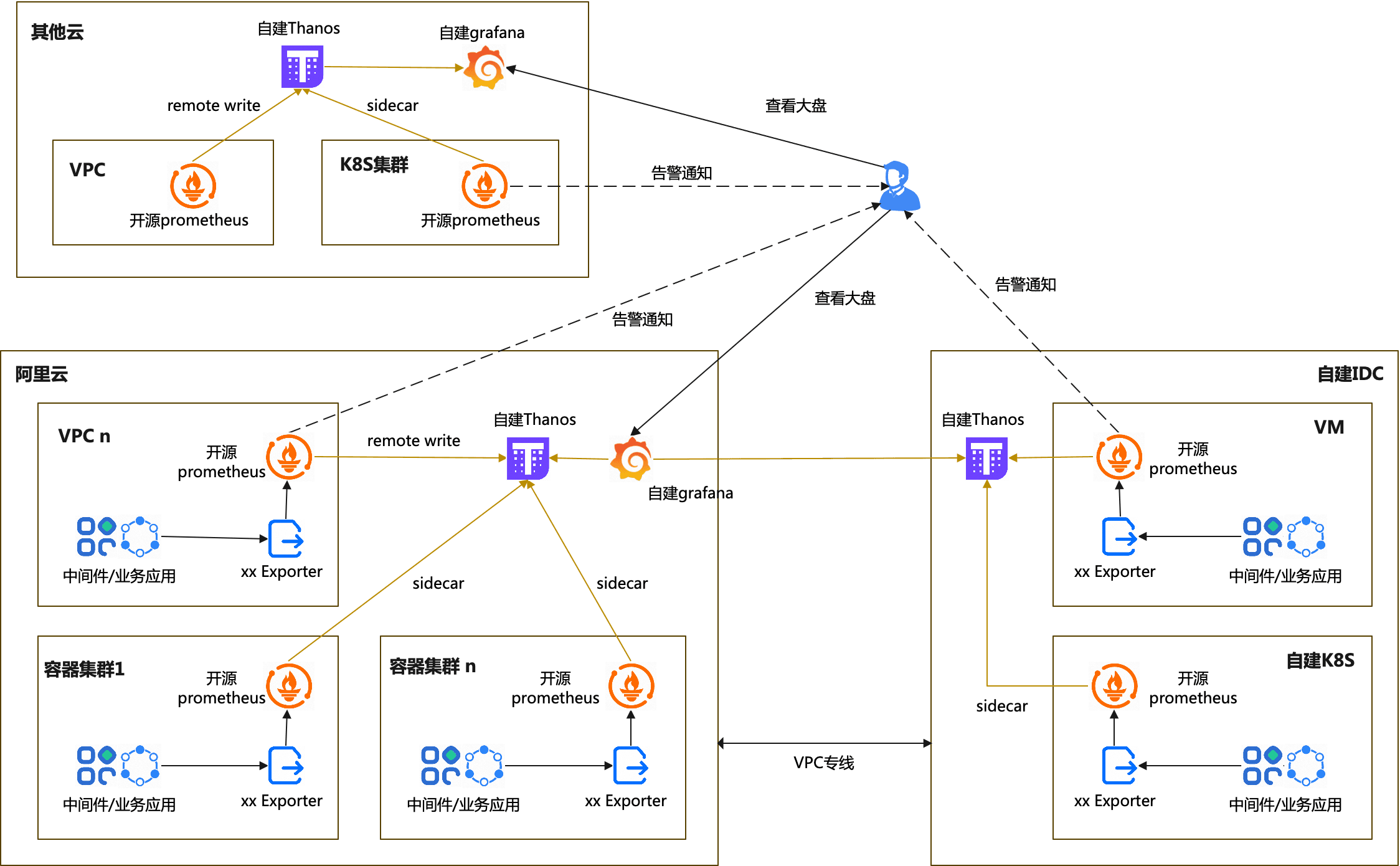 目前典型自建开源Prometheus+Thanos的部署场景包括: