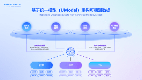 我们现在基于 UModel,已经覆盖了 6 大核心领域、创建了 1800 多个模型,并且这是完全开放可扩展的。我认为它真正的革命性在于,它重构了可观测世界的范式,将数据、知识、行动这三个核心要素绑定在了一起: