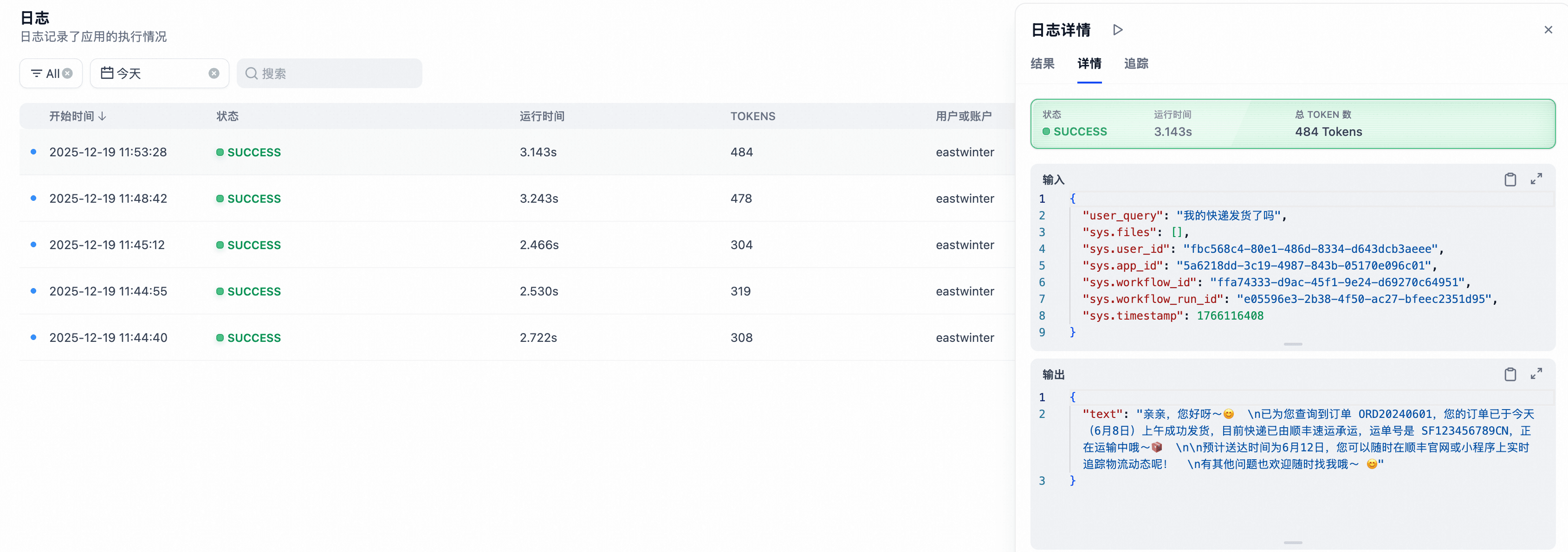 ● 日志回溯:Dify 控制台的日志详情页直接从 SLS 读取数据,响应更迅速。
