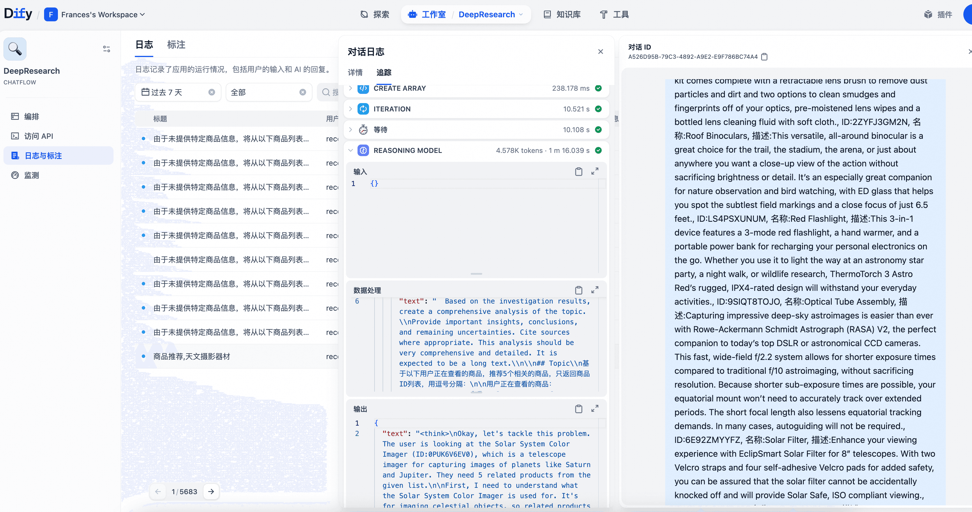 Dify的工作流记录包含了用户提问、知识召回、工具调用和模型响应等数据,是评估和回归等任务需要的数据资产,长期留存价值高。