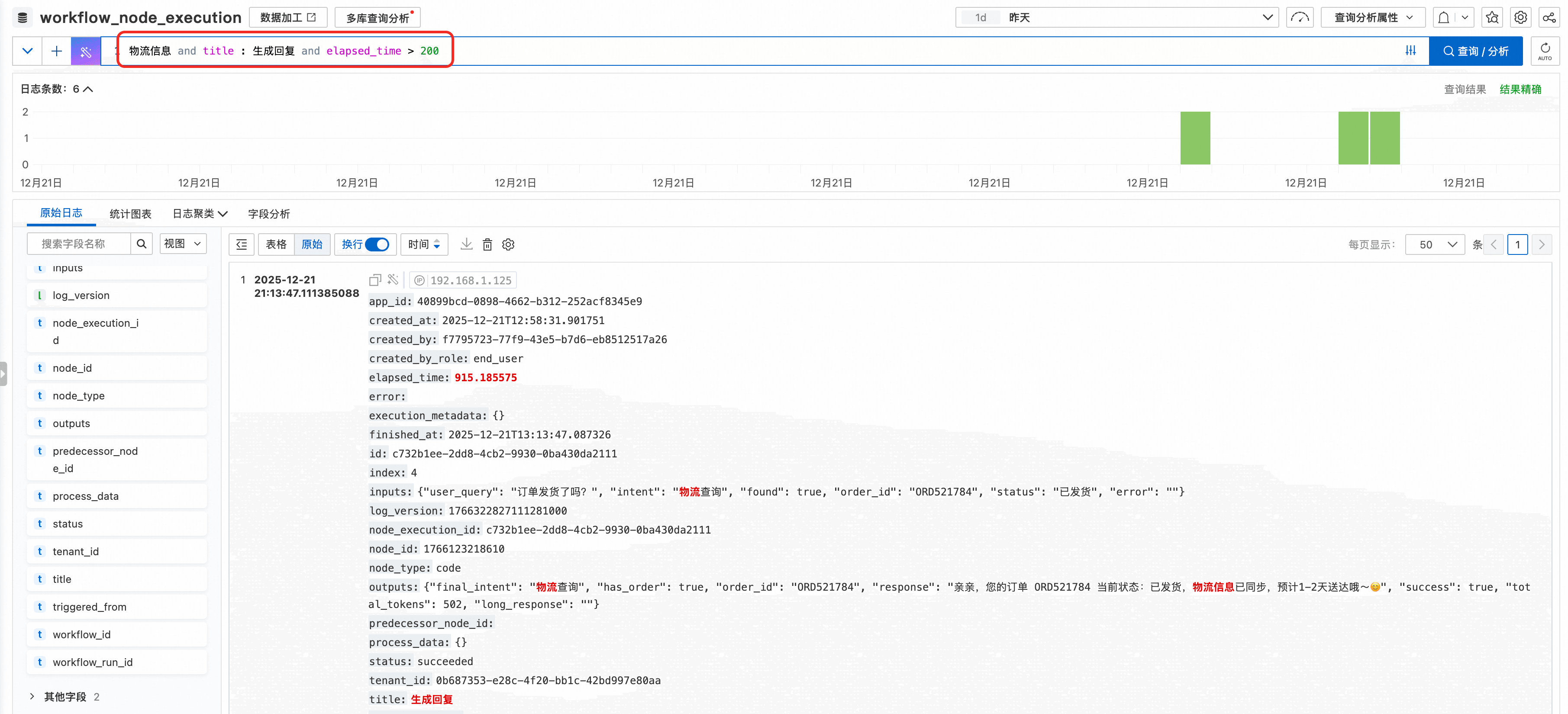 总之,将 Dify 工作流日志接入 SLS,不仅能高效查询日志,更能通过分析、可视化、告警和数据加工,将日志转化为业务洞察,真正实现从“看日志”到“懂业务”的跃升。