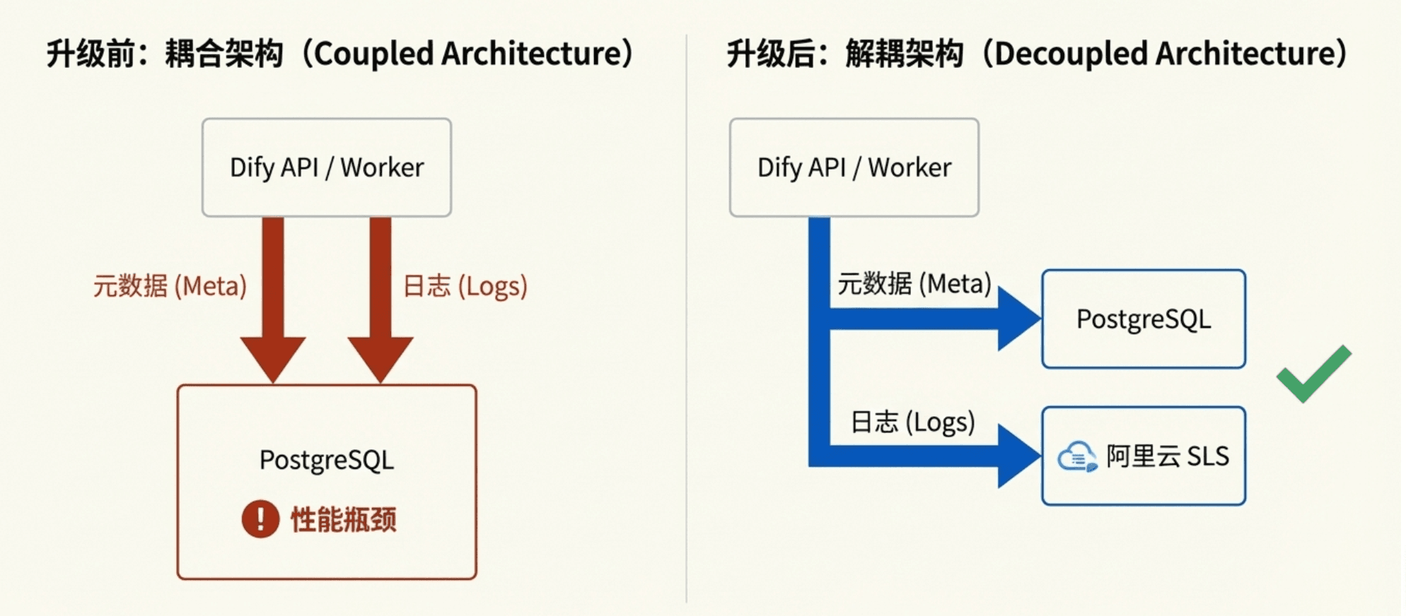 ● 资源隔离:将日志负载剥离至 SLS 云端,实现日志数据流与 Dify 核心业务事务的物理隔离,有效保障主业务系统的稳定性与性能。