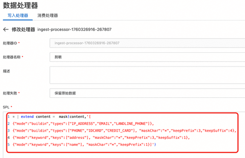 - 写入脱敏:通过写入处理器配置 SPL 脱敏(mask )函数,确保敏感字段在入库时已被打码。
