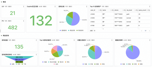 - 用户行为:咨询后购买转化漏斗,以及热门咨询关键词,助力优化产品和营销策略。