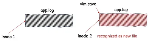 - inode变化。vim创建新文件替换原文件时,新文件的inode与原文件不同,可能导致采集器误判为新文件。