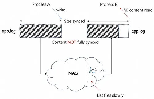 - 读取到文件空洞。当元信息显示文件已增大,但实际内容尚未同步时,读取操作可能返回\0字符(文件空洞)。