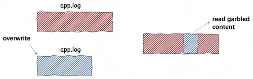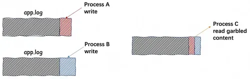 - 文件内容交叉。多个进程的写入可能相互交叉,导致日志条目混乱。