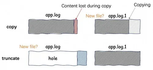 - copy和truncate之间产生的日志可能丢失。在这两个操作之间有一个时间窗口,此时写入的内容既不在复制的文件中,又会被截断操作清除。