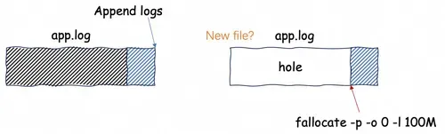 **推荐使用标准的日志轮转机制来管理日志文件大小,如使用logrotate工具定期轮转日志文件,这样可以保证日志的完整性和可追溯性。**如无法避免,建议使用fallocate而非truncate或dd,并在消费端做好异常日志的兼容逻辑。