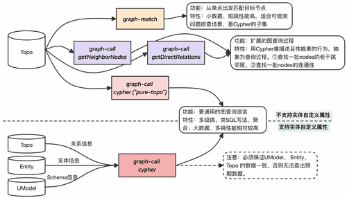 当三方面数据都完整时,用户可以使用完整版 Cypher 的所有功能,包括基于自定义属性的查询、多级路径输出等。当 Entity 数据不完整但 Topo 数据完整时,可以使用 pure-topo 模式进行查询,这种模式下查询速度会更快,但只能基于拓扑结构进行查询,无法使用实体属性进行筛选。当 Topo 数据不完整时,虽然 Entity 数据完整,也无法进行图查询,因为图查询的核心是关系,没有关系数据就无法构成图。