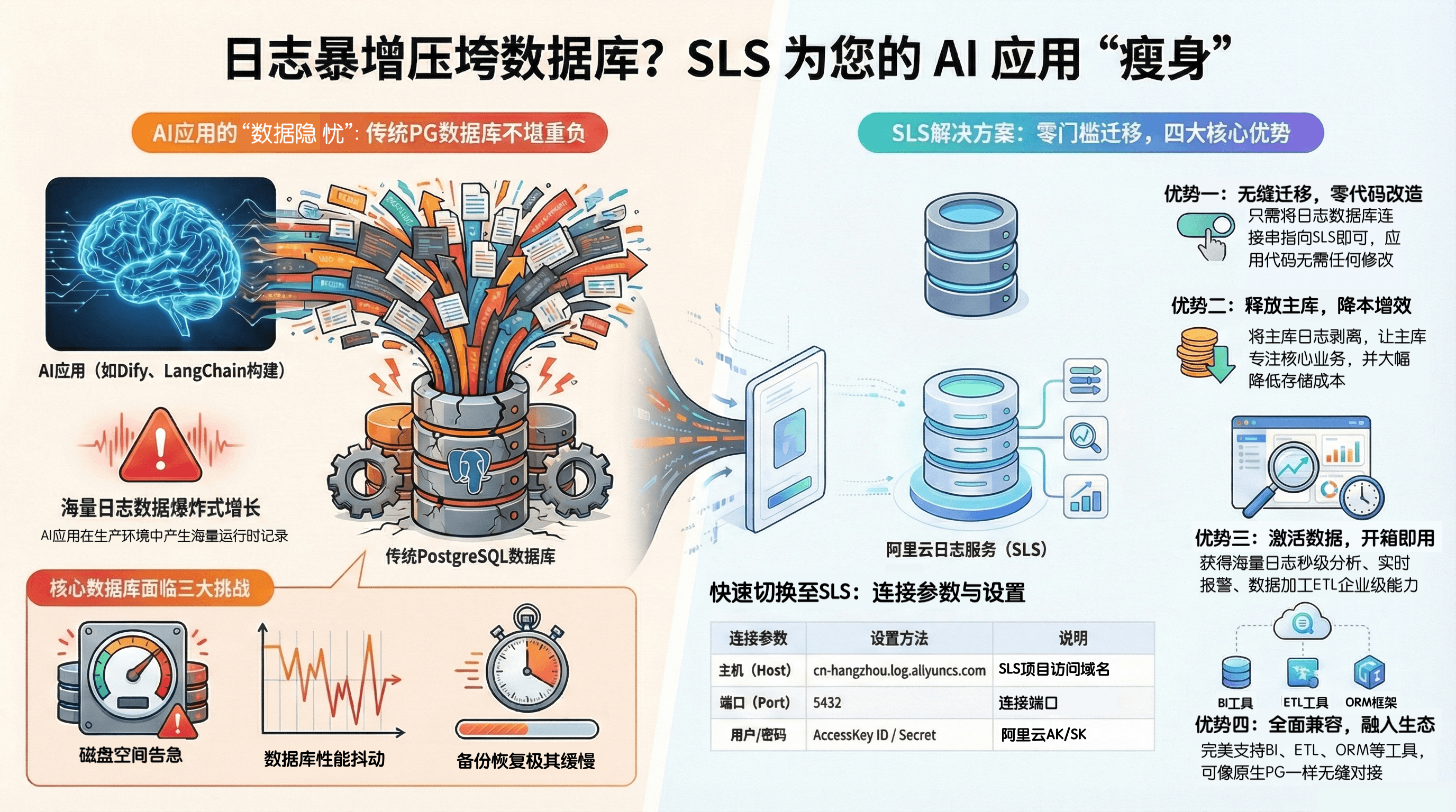 面对海量 AI 日志带来的数据库“高血压”问题,SLS 给出的解法不是单纯的扩容,而是架构层面的结构性优化。下面这张图直观展示了使用SLS兼容PG协议的几大优势。