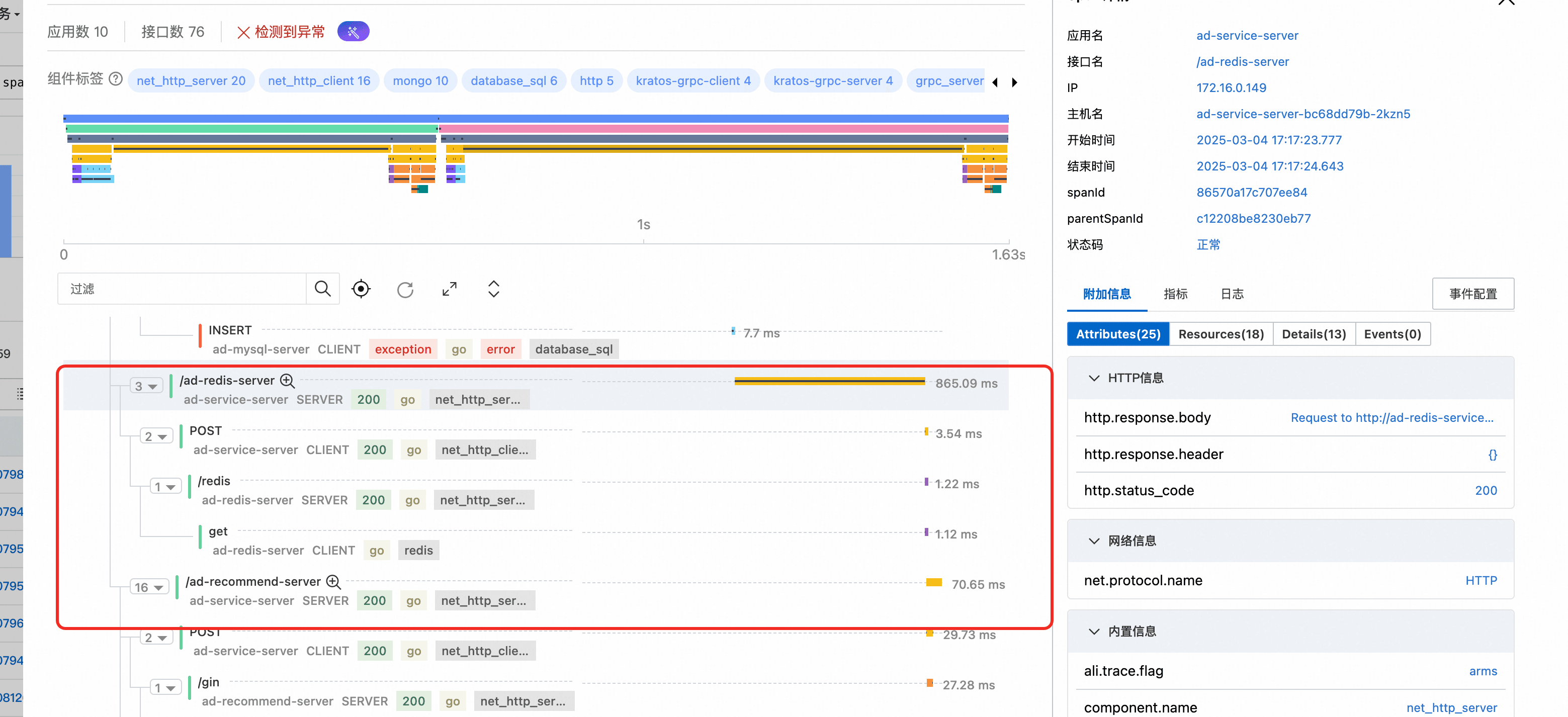 点击查看调用链详情,可以看到它的子span调用时间都非常短,可以确定是这个接口本身慢导致的,而不是其他对外请求导致的。